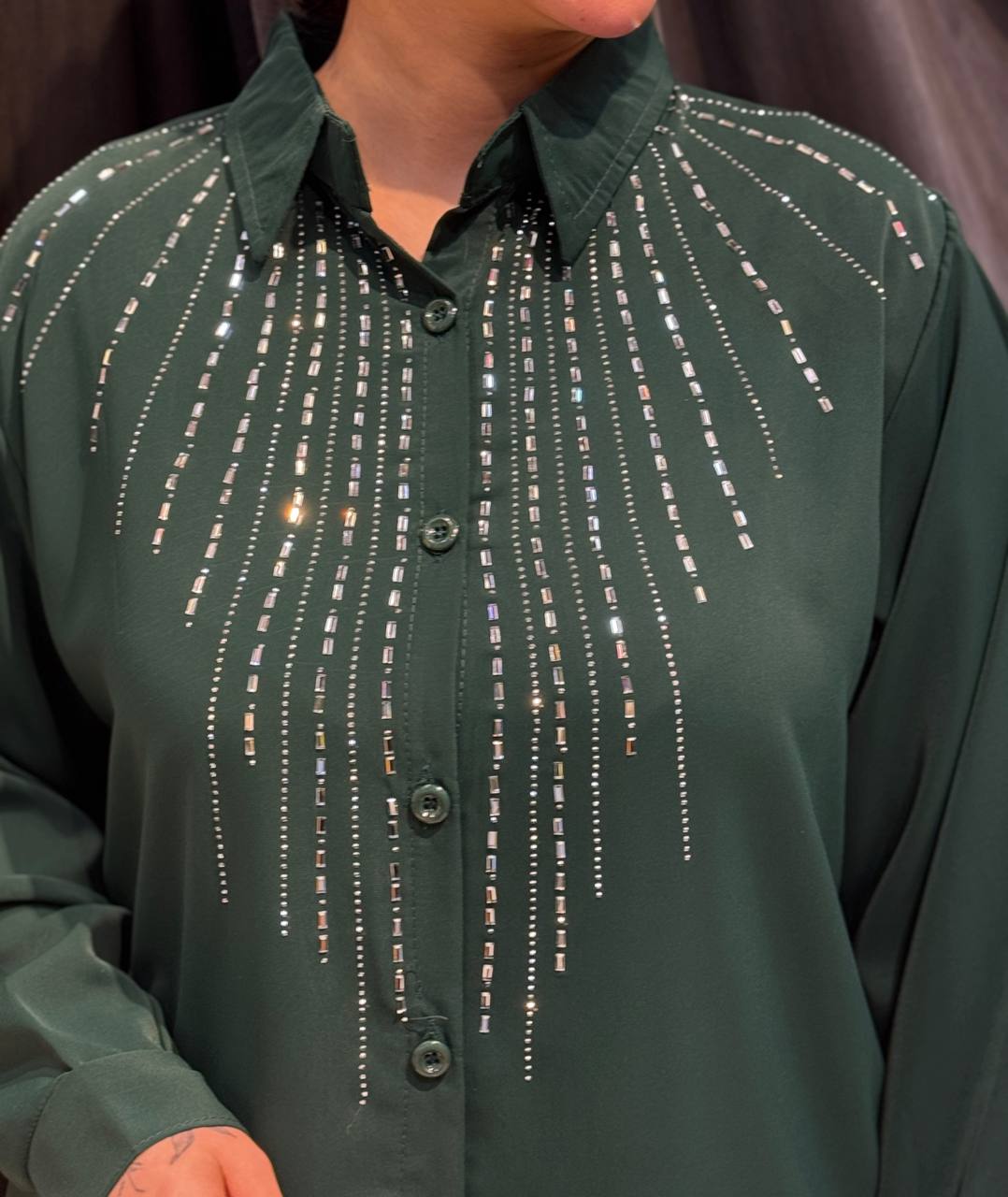 ✨ نگیندوزی استراتژیک: طراحی خطوط عمودی نگیندار جهت بلندتر نشان دادن قد و بالاتنه.
