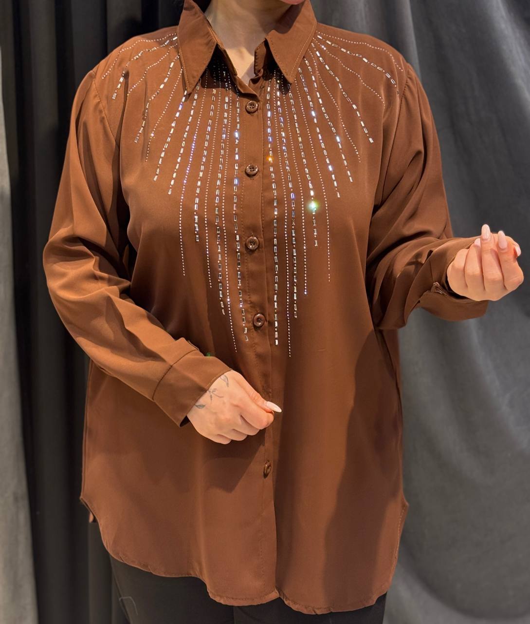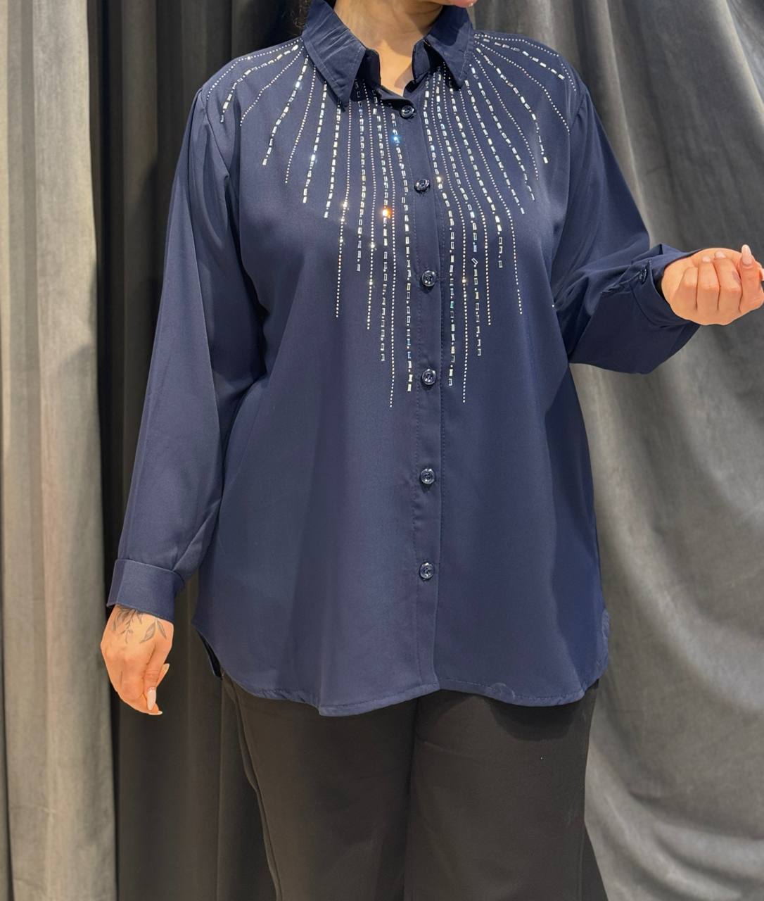 این محصول به صورت فریسایز طراحی شده و به دلیل الگوی استاندارد، برای بازه سایزی ۴۲ تا ۵۴ تنخوری بسیار راحت و شیک دارد. قد ۹۰ سانتیمتری این شومیز پوشش کاملی ایجاد میکند که آن را برای ست کردن با انواع شلوارهای پارچهای کلاسیک یا لگهای مجلسی ایدهآل میسازد. نگینهای استفاده شده در این کار با تکنولوژی پرس باکیفیت نصب شدهاند تا در اثر شستشو آسیب نبینند. با توجه به موجودی تکعدد، این شومیز یک انتخاب خاص برای خانمهایی است که به تکپوش بودن اهمیت میدهند.