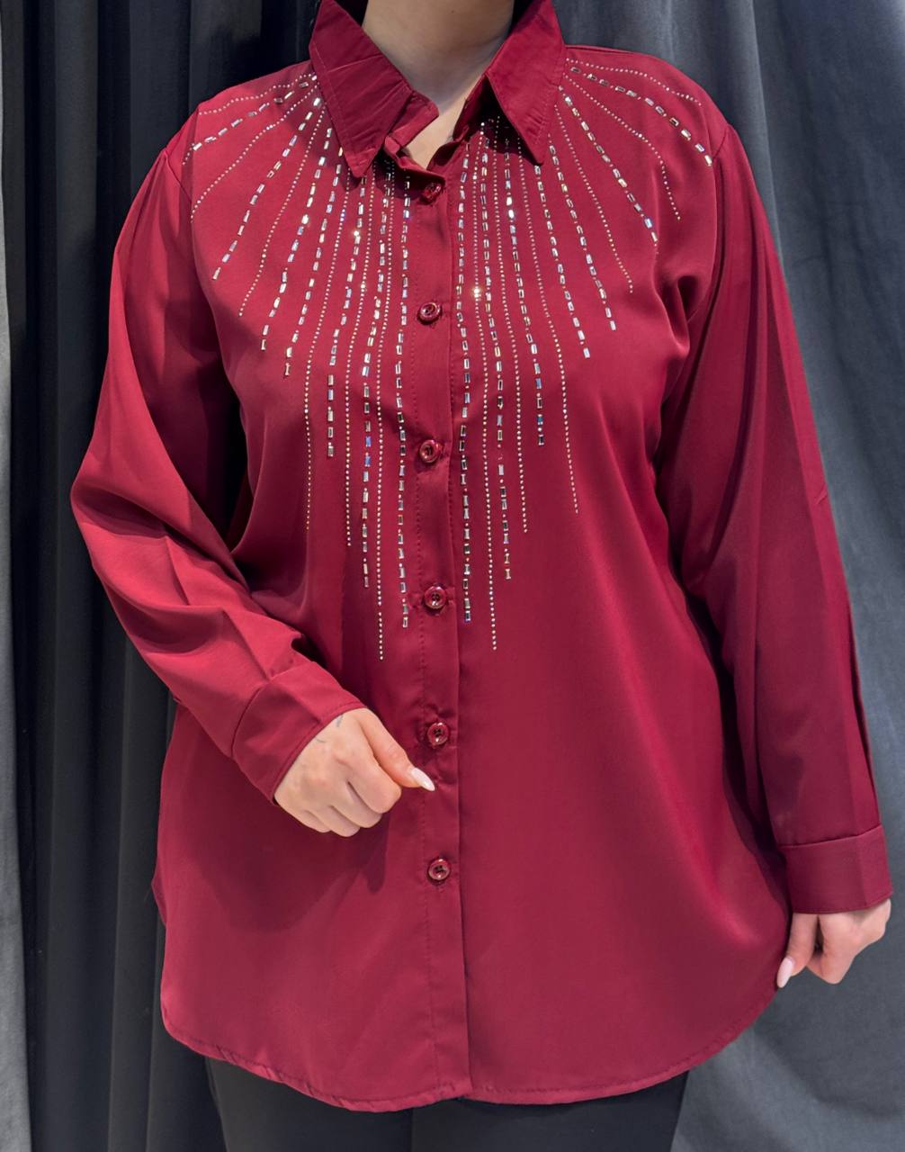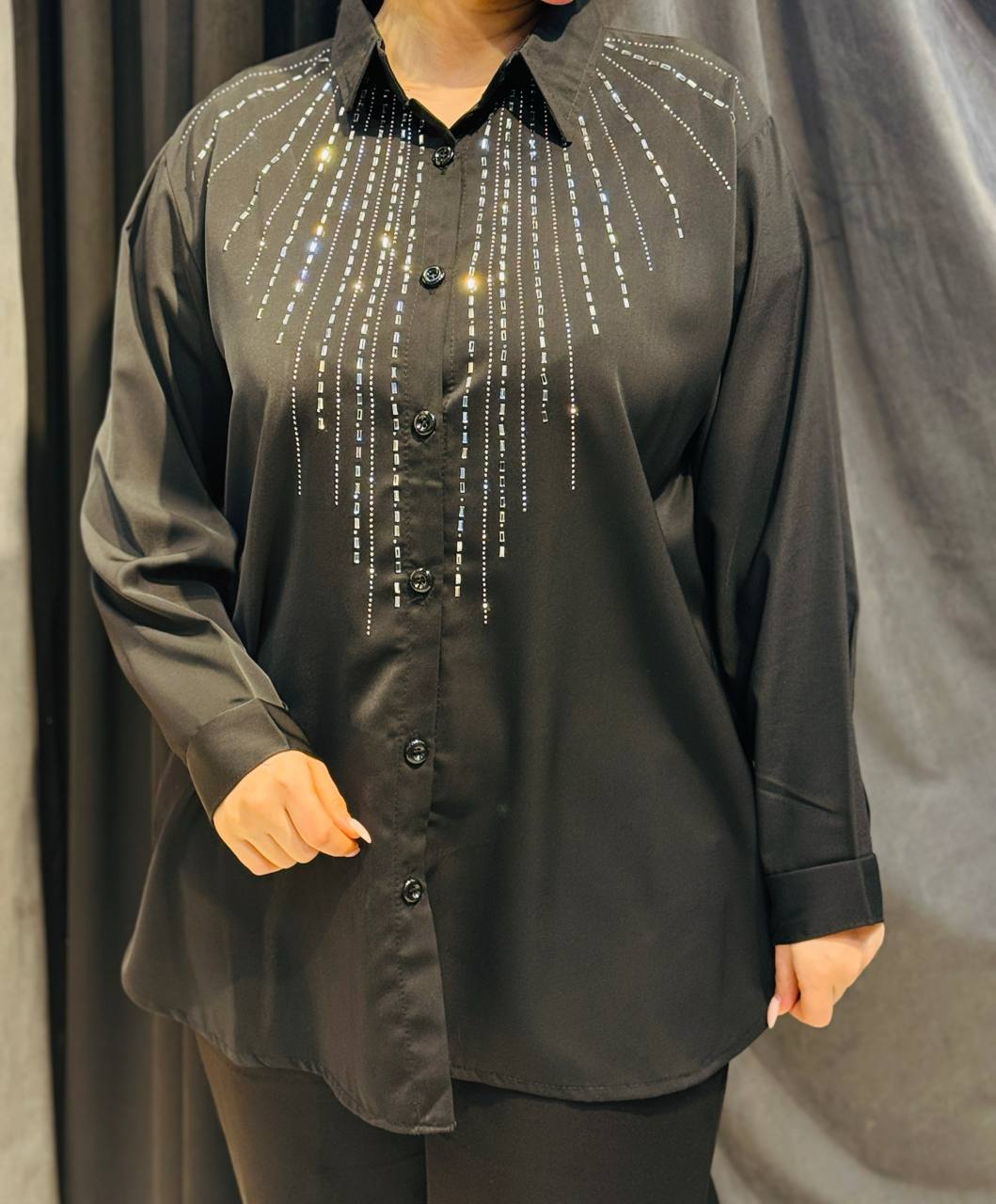 شومیز مجلسی نگیندار مدل جواهر جنس کرپ الیزه اعلا (فریسایز ۴۲ تا ۵۴)