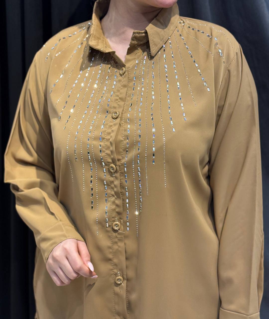 درخشش در مجالس را با شومیز نگیندار مدل جواهر تجربه کنید. این شومیز از پارچه کرپ الیزه درجه یک تهیه شده است که به دلیل ریزش عالی و بافت لطیف، به زیبایی بر روی اندام مینشیند و به هیچ عنوان چروک نمیشود. ویژگی اصلی این کار، طراحی عمودی نگینهای درخشان در قسمت بالاتنه است که نه تنها جلوهای لوکس به لباس بخشیده، بلکه باعث میشود اندام شما کشیدهتر و لاغرتر به نظر برسد.