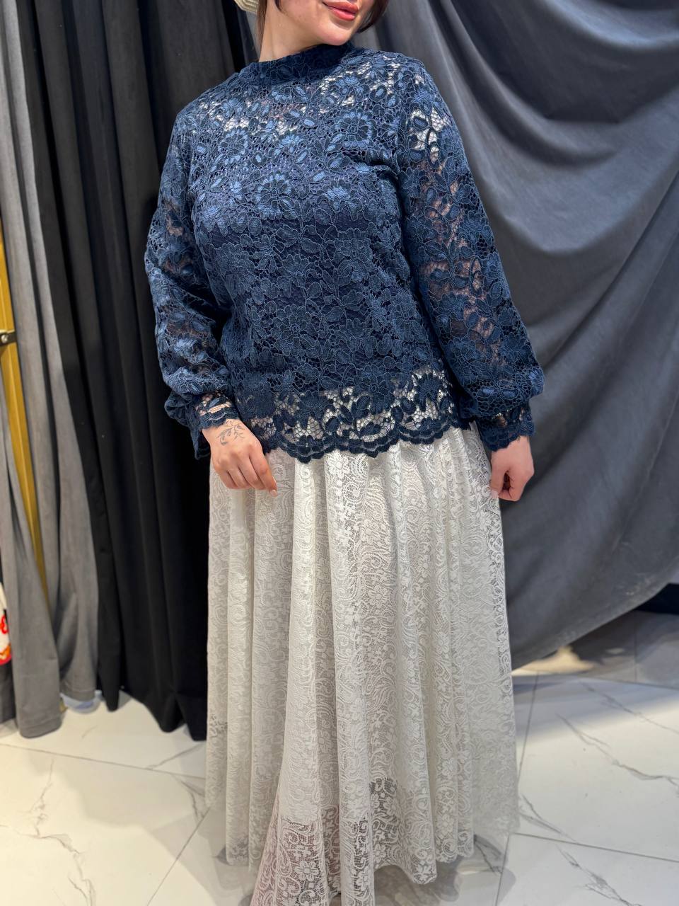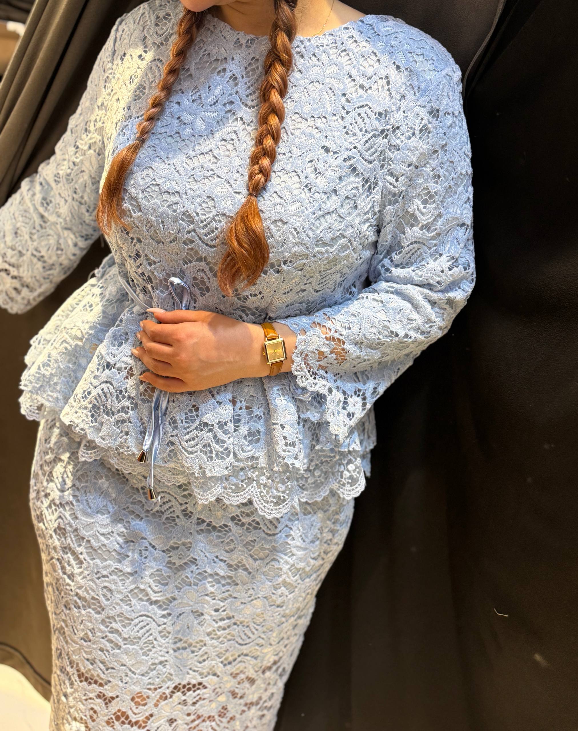ناموجودست شومیز و دامن مجلسی مدل الیزه ترکیب دانتل و مخمل ترک (آستردار بههمراه کمربند)
